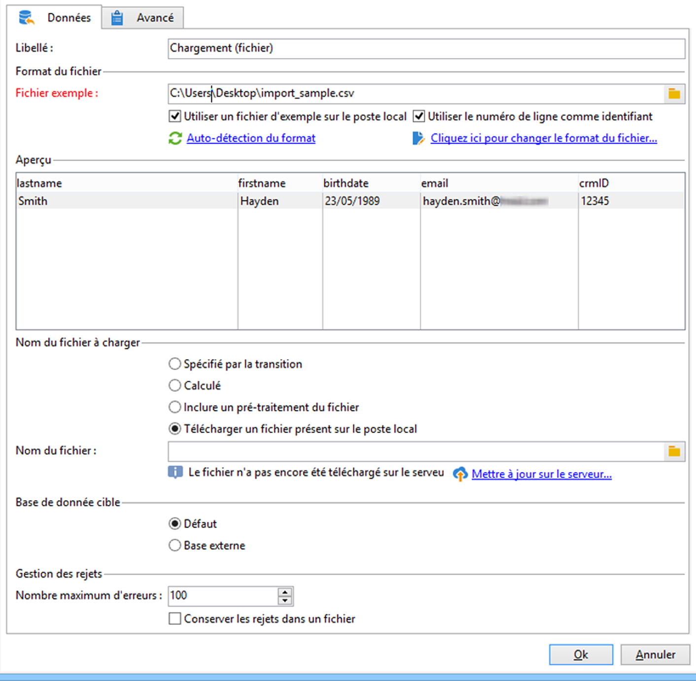 Dans la section Nom du fichier à charger, sélectionnez Télécharger un fichier présent sur le poste local et laissez le champ vide. A chaque fois qu'un nouveau workflow sera créé à partir de ce modèle, vous pourrez préciser ici le fichier souhaité (tant qu'il correspond à la structure définie).