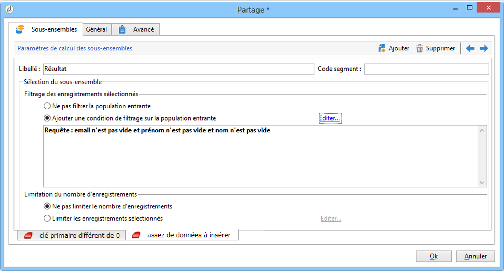Dans le premier sous-ensemble de l'onglet Sous-ensembles, ajoutez une condition de filtrage sur la population entrante pour sélectionner uniquement les enregistrements pour lesquels la clé primaire du destinataire est différente de 0. De cette manière les données du fichier réconciliées avec les destinataires de la base de données sont sélectionnées dans ce sous-ensemble.