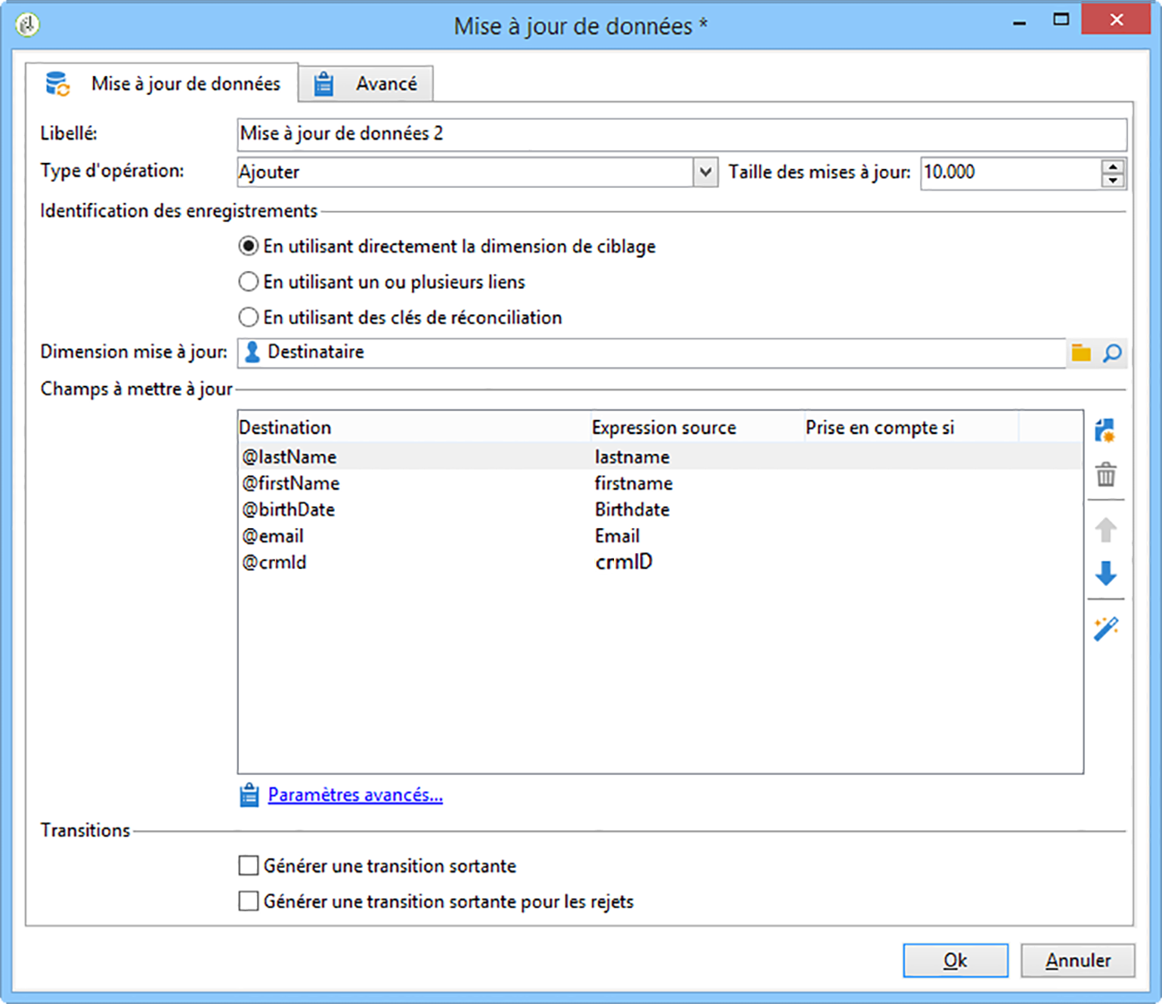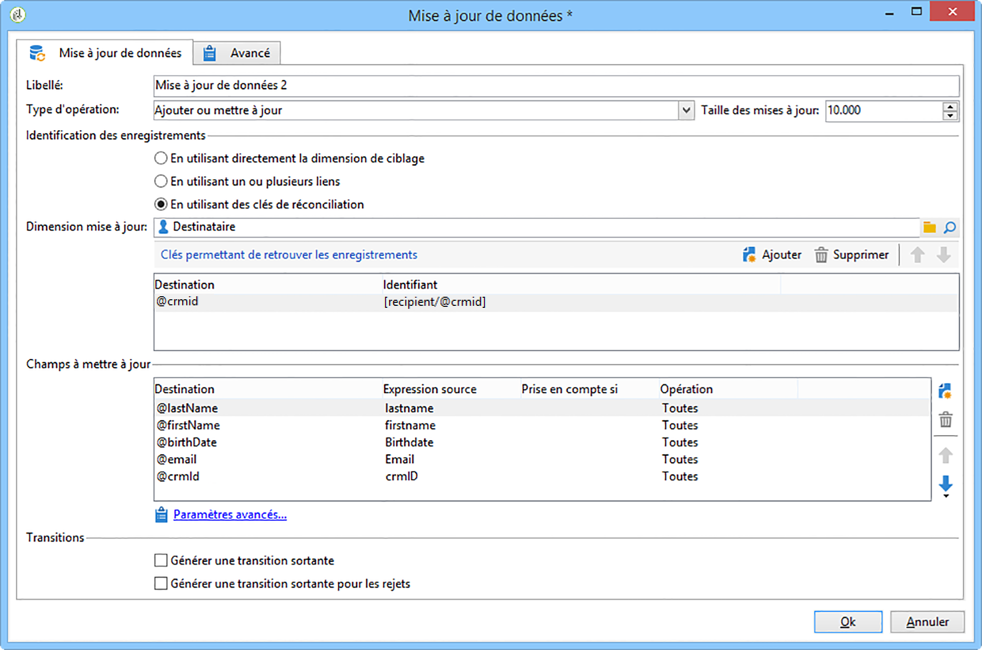 Sélectionnez Mise à jour comme Type d'opération, puisque la transition entrante contient uniquement des destinataires déjà présents dans la base de données.