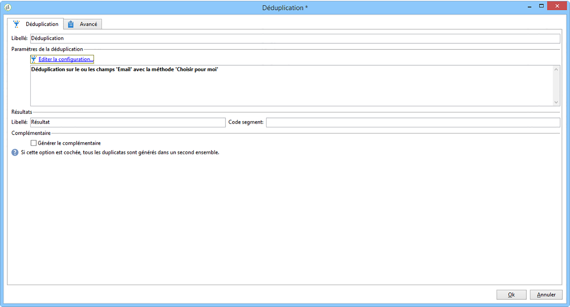 Dans l'écran Méthode de déduplication, sélectionnez Paramètres avancés et cochez l'option Désactiver le filtrage automatique des enregistrements d'identifiant 0 pour veiller à ce que les enregistrements dont la clé primaire est égale à 0 (normalement, tous les enregistrements de cette transition) sont exclus.
