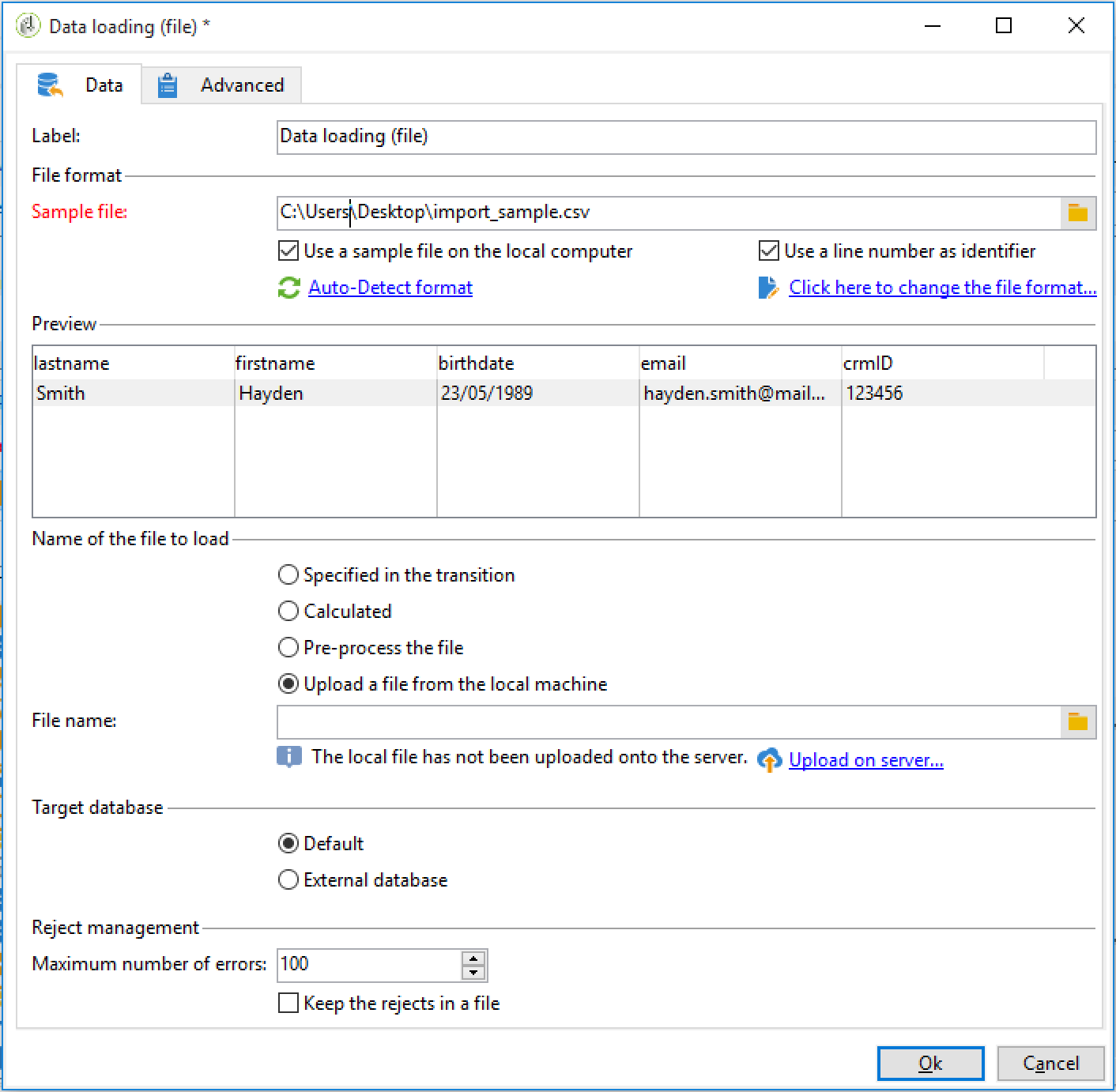 에서 Name of the file to load 섹션, Upload a file from the local machine 필드를 비워 둡니다. 이 템플릿에서 새 워크플로우를 만들 때마다 정의된 구조에 해당하는 한 여기에 원하는 파일을 지정할 수 있습니다.
