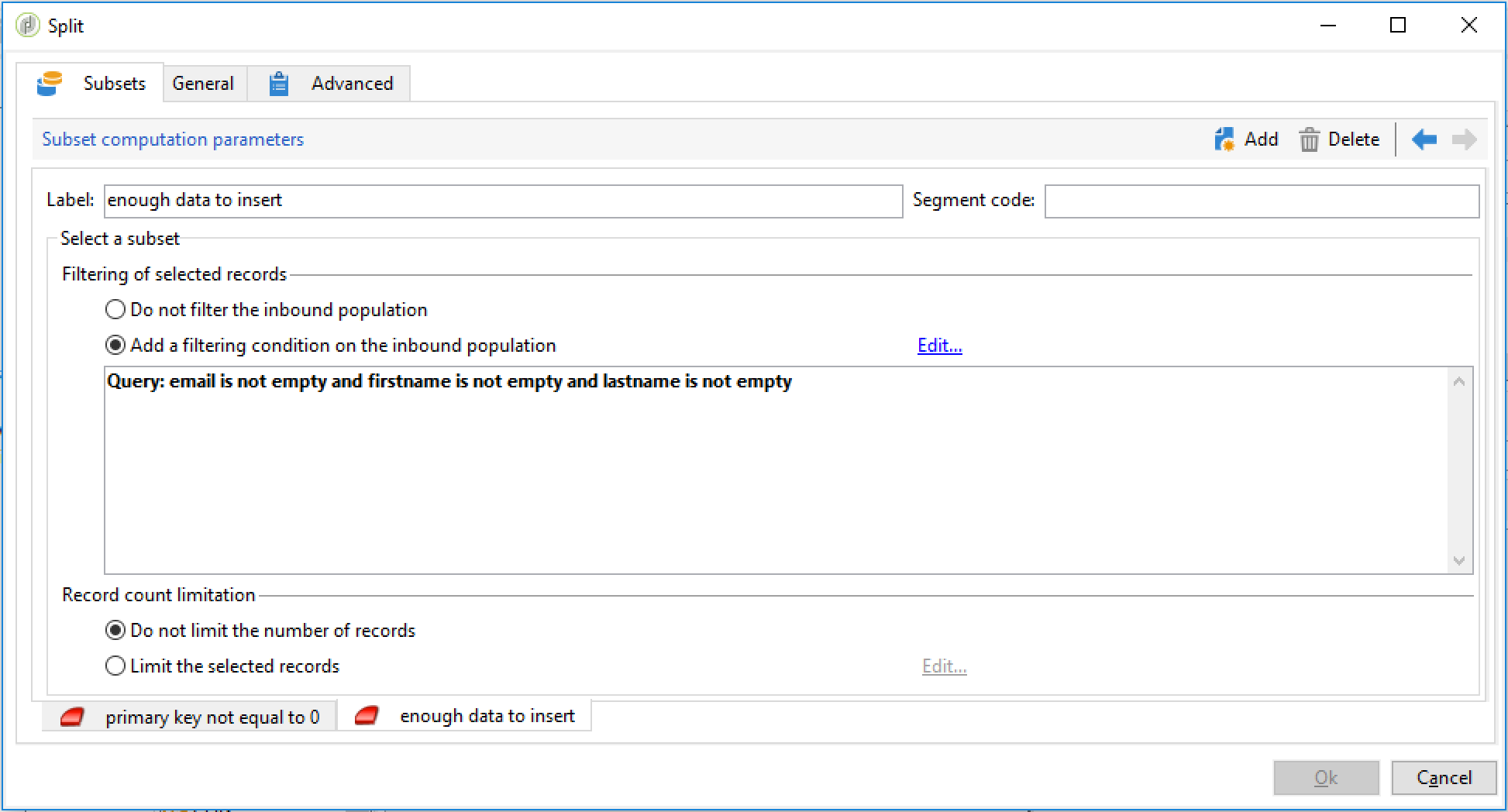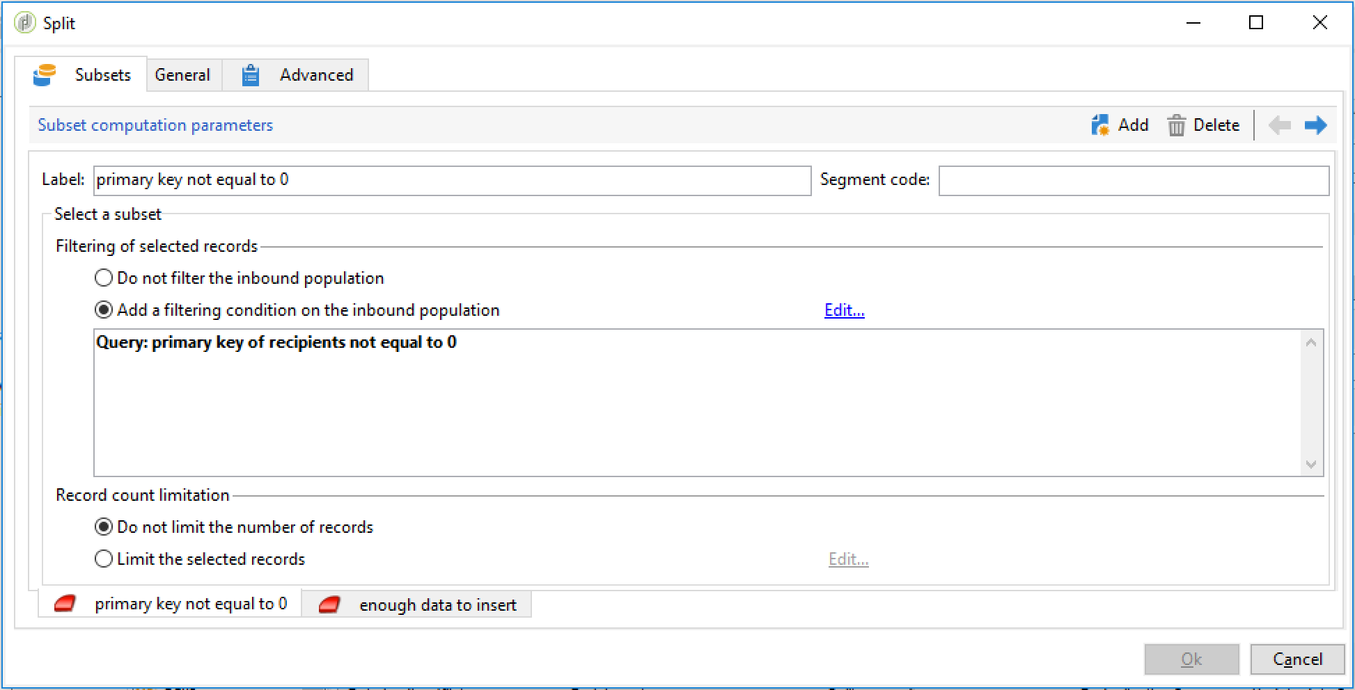 의 첫 번째 하위 집합에서 Subsets 탭에서 수신자 기본 키가 0이 아닌 레코드만 선택하려면 인바운드 모집단에 필터링 조건을 추가합니다. 이렇게 하면 데이터베이스의 수신자와 조정된 파일의 데이터가 해당 하위 집합에서 선택됩니다.
