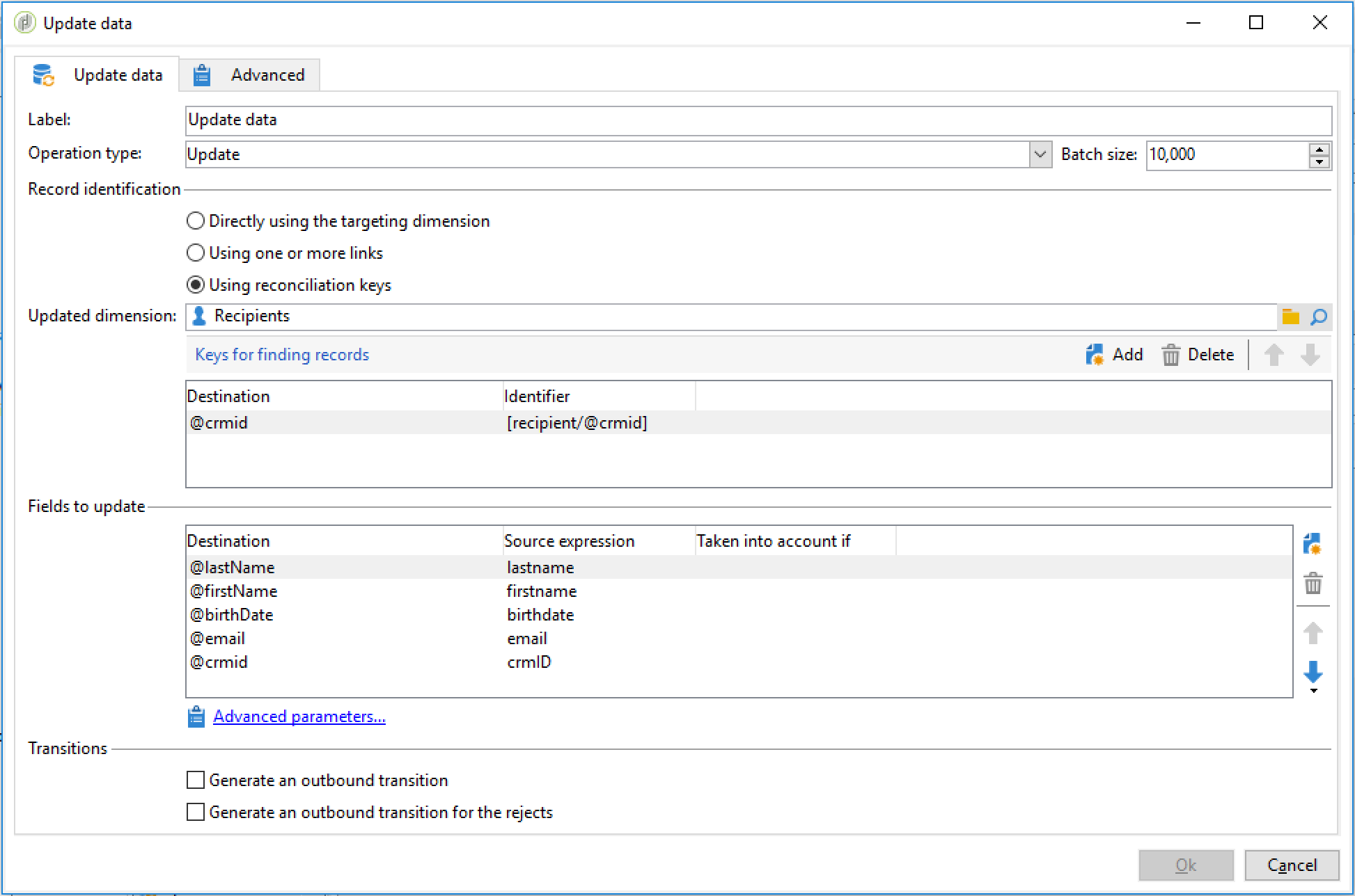 선택 Update 로서의 Operation type 인바운드 전환에는 데이터베이스에 이미 있는 수신자만 포함되므로