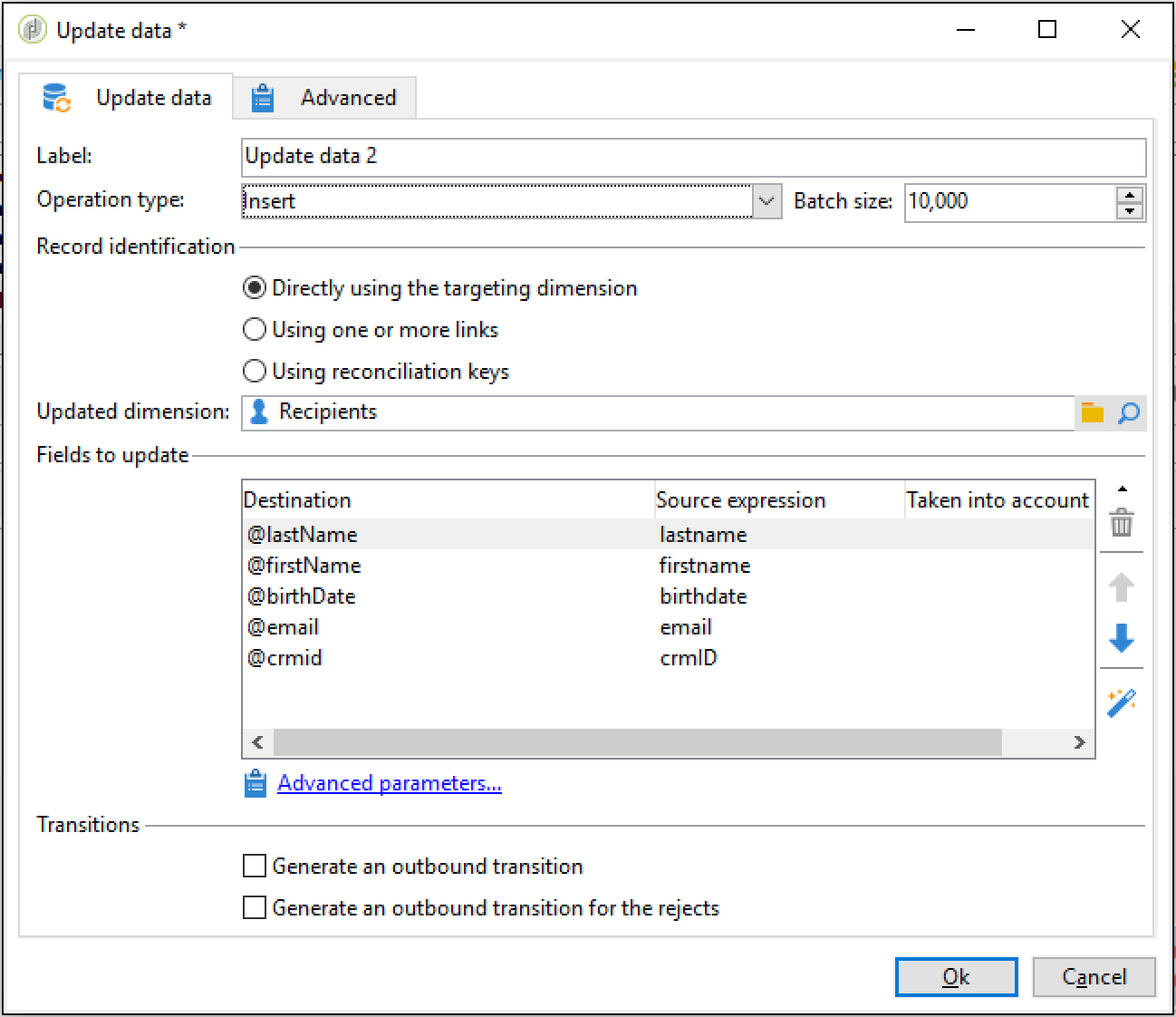 에서 Deduplication method 화면, 선택 Advanced parameters 그리고 Disable automatic filtering of 0 ID records 기본 키가 0인 레코드(이 전환의 모든 레코드여야 함)가 제외되지 않도록 하는 옵션입니다.