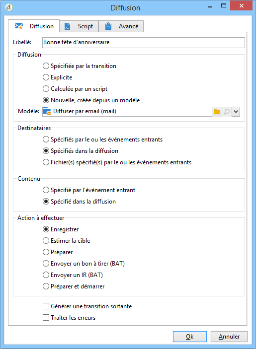Ajoutez une activité Diffusion et reliez-la à la transition sortante de l'activité Transfert de fichier. Configurez-la de la manière suivante :