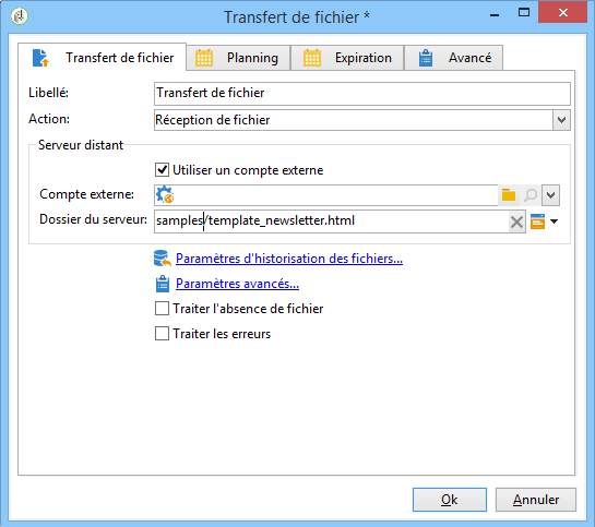Ajoutez une activité Transfert de fichier à votre workflow, puis configurez-la en indiquant les informations suivantes :