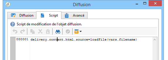 Dans l'onglet Script de l'activité Diffusion, ajoutez la commande suivante pour charger le contenu du fichier importé dans la diffusion :