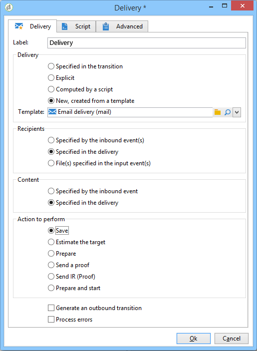 추가 Delivery 활동 및 를 아웃바운드 전환 File transfer 활동. 다음과 같이 구성합니다.