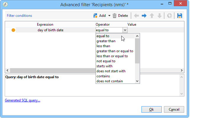 쿼리 편집기에서 의 첫 번째 셀에서 Operator 열, 선택 equal to.