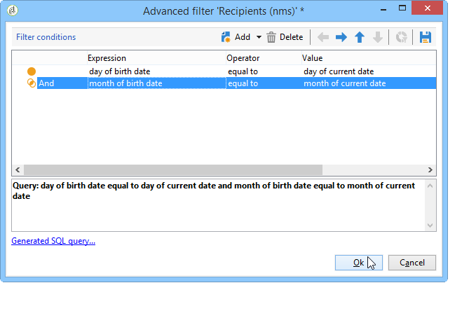 생일이 현재 날짜에 해당하는 수신자 선택 생일인 수신자 식별 섹션을 참조하십시오.