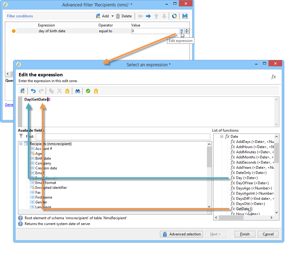 사용 가능한 필드 목록에서 두 번 클릭합니다 Birth date. 그러면 편집기의 위쪽 섹션에 다음 수식이 표시됩니다.