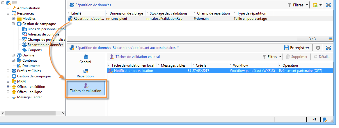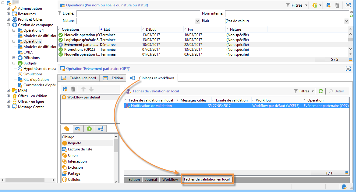 Dans le workflow de ciblage de votre opération, cliquez sur l'onglet Tâches de validation en local.