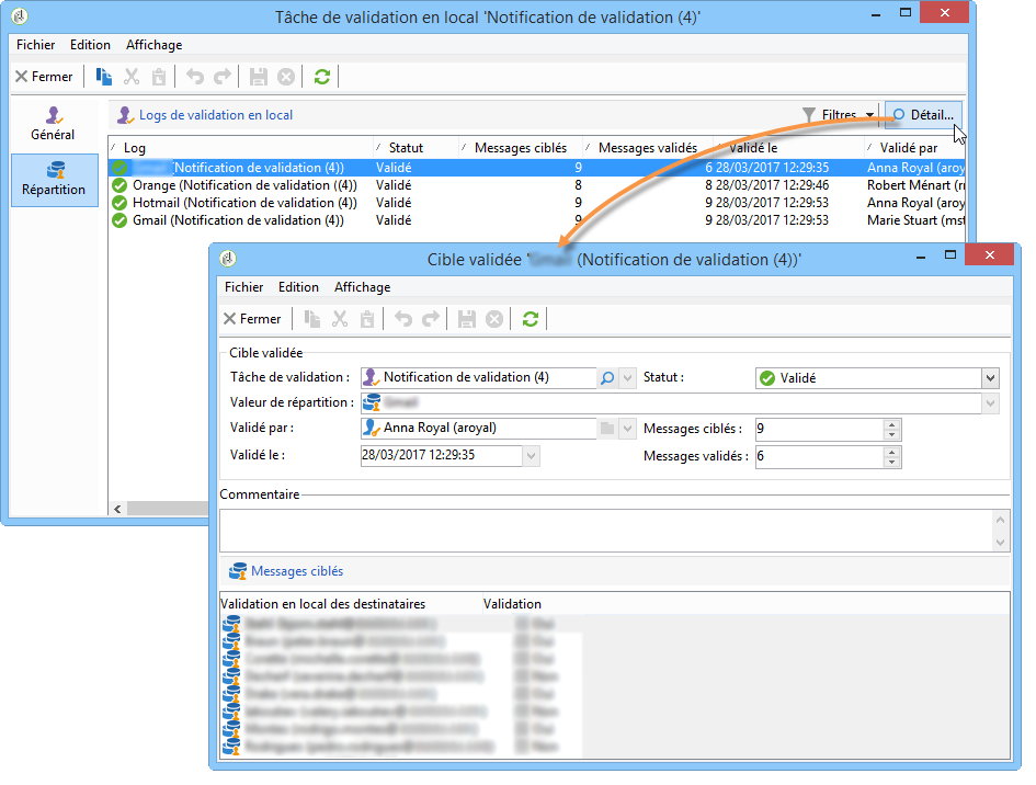 L'onglet Ciblés du log de validation affiche la liste des destinataires ciblés et leur statut de validation. Vous avez la possibilité de modifier ce statut si besoin.