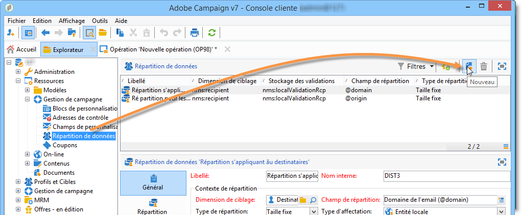 Pour créer le modèle de répartition de données, positionnez-vous sur le noeud Ressources > Gestion de campagne > Répartition de données, et cliquez sur le bouton Nouveau.