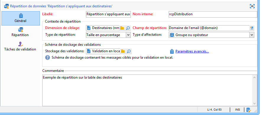 Renseignez le Libellé et le Contexte de répartition. Dans notre exemple, nous avons sélectionné le schéma de ciblage Destinataire et le champ Domaine de l'email comme champ de répartition. La liste de destinataires sera répartie par domaine.