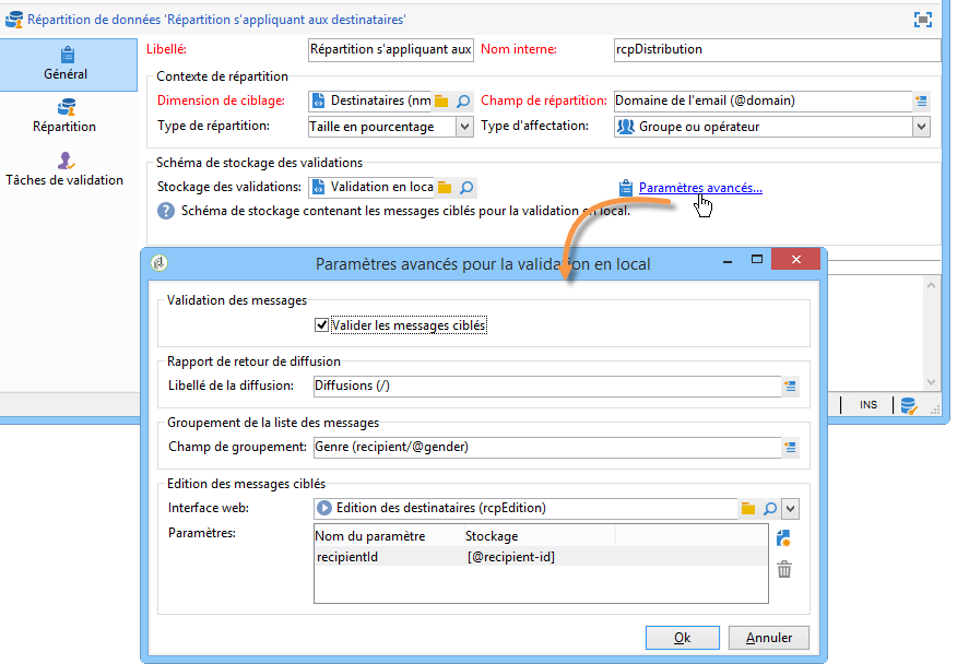Dans le champ Stockage des validations, renseignez le schéma de stockage des validations correspondant au schéma de ciblage utilisé. Ici nous utilisons le schéma de stockage par défaut : Validation en local des destinataire.