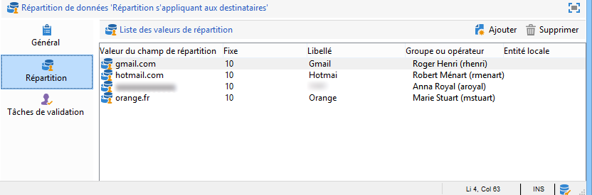 Le modèle de répartition de données permet de limiter la population issue du ciblage à partir d'un groupement de données, et permet d'affecter chaque valeur du groupement à un responsable local. Dans notre exemple, nous avons défini le champ Domaine de l'adresse email comme champ de répartition et affecté un domaine à chaque responsable local.