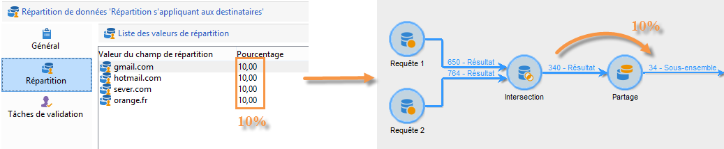 Pourcentage / Fixe : saisissez, pour chaque domaine, la limite de destinataires auxquels vous souhaitez envoyer la diffusion. Dans notre exemple, nous avons choisi de limiter l'envoi à 10% pour chaque domaine.