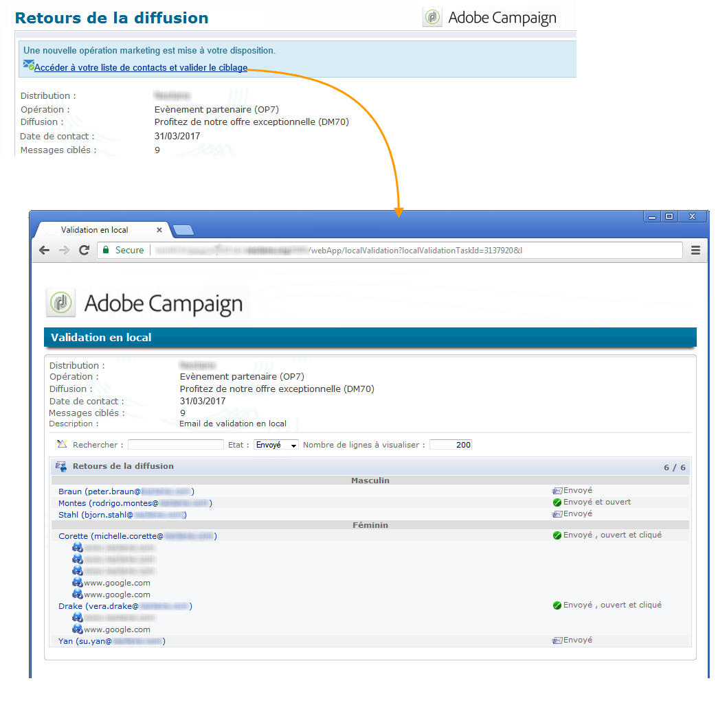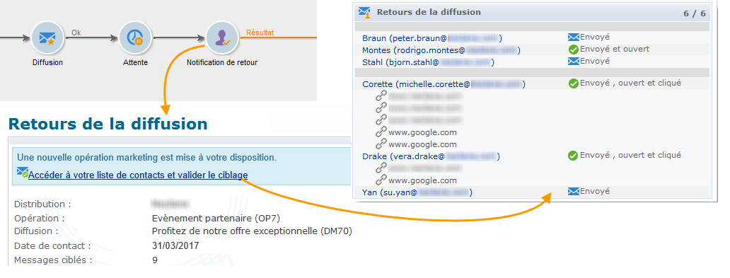 Quelques jours plus tard, la seconde activité de type Validation en local envoie un email de notification à chaque responsable local lui indiquant les actions effectuées par ses contacts (clics, ouvertures, etc.).