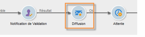 Lorsque la date limite de validation est atteinte, le workflow reprend. Dans notre exemple, l'activité Diffusion démarre et la diffusion est envoyée aux cibles validées.