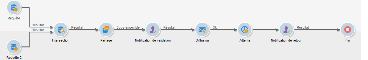 Si vous ne souhaitez pas limiter la population issue de la requête, il n'est pas nécessaire d'utiliser les activités Requête, Intersection et Partage. Dans ce cas, renseignez le modèle de répartition de données dans la première activité de type Validation en local.