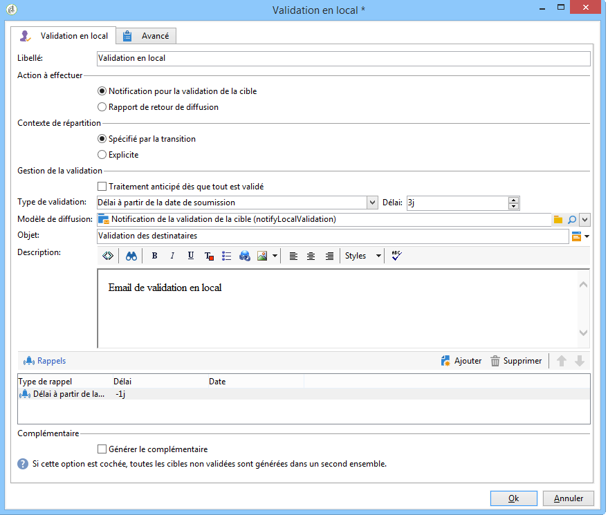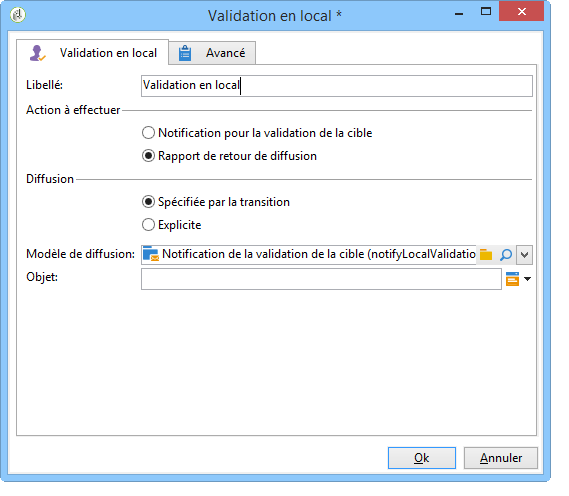 Dans la section Notification, sélectionnez le modèle de diffusion ainsi que l'objet qui seront utilisés pour l'email de notification. Dans notre exemple, nous avons choisi le modèle par défaut : Notification de la validation en local.