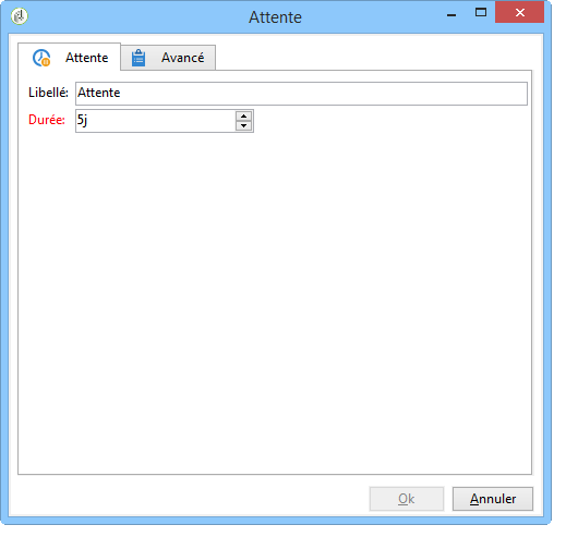 L'activité d'attente permet de retarder le démarrage de la seconde activité de validation en local qui enverra la notification de retour de diffusion. Dans le champ Durée, nous avons saisi la valeur 5j (5 jours). Les actions effectuées par les destinataires au cours des 5 jours suivant l'envoi de la diffusion seront prises en compte pour la notification de retour.