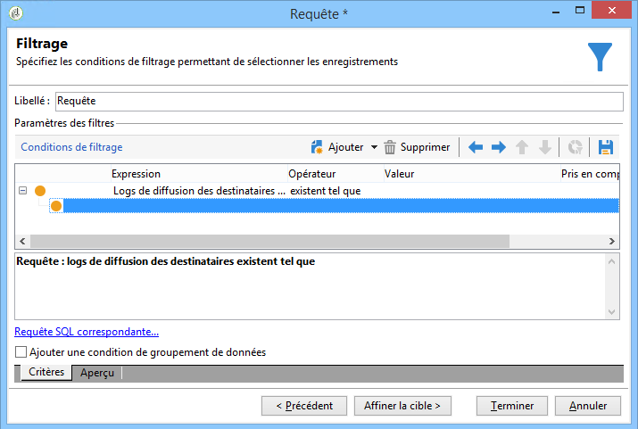 Définissez la condition de filtrage suivante pour cibler les destinataires qui se trouvent dans le log de diffusion. Sélectionnez Log de diffusion d'un destinataire (broadlog) dans la colonne Expression. Sélectionnez ensuite existent tel que dans la colonne Opérateur.