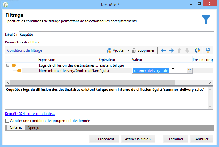 Cliquez sur Edition de la requête et définissez les dimensions de ciblage et de filtrage sur Destinataires.