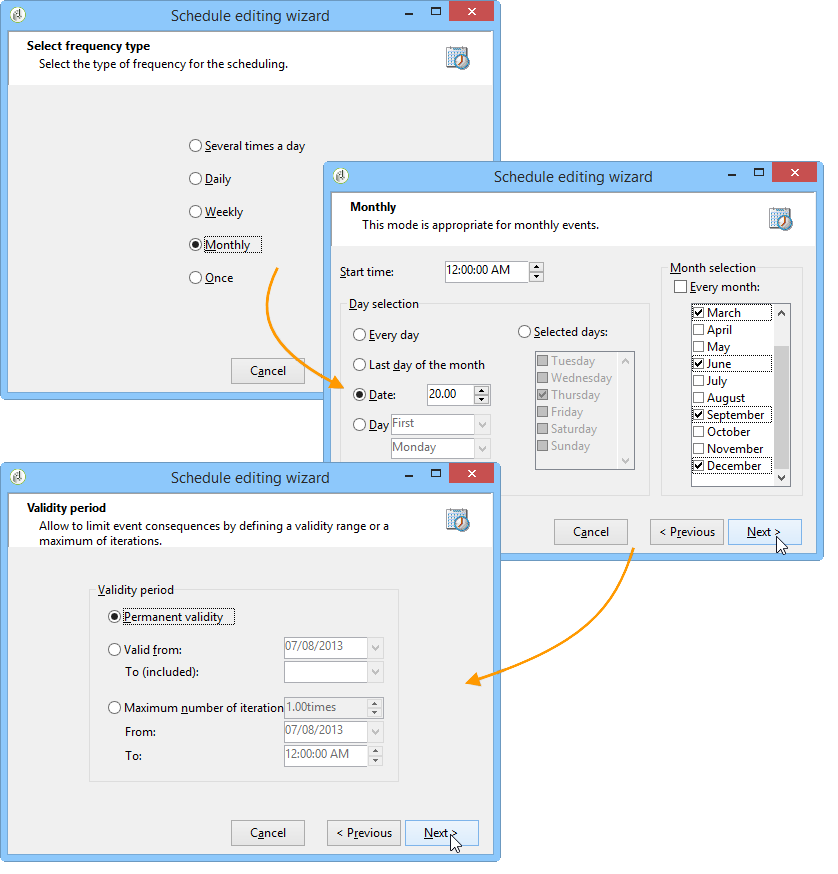 다음 화면에서 3월, 6월, 9월 및 12월을 선택합니다. 그 달의 20일을 선택하고 워크플로우를 시작할 시간을 선택합니다.