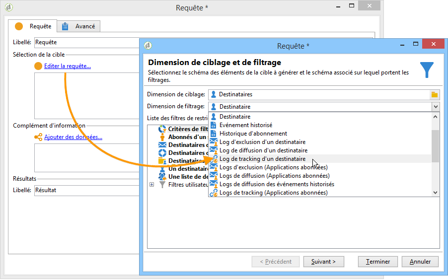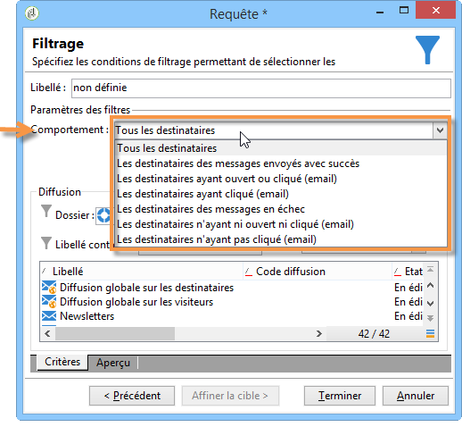 Dans la fenêtre Dimension de ciblage et de filtrage, double-cliquez sur le filtre Destinataires d'une diffusion.