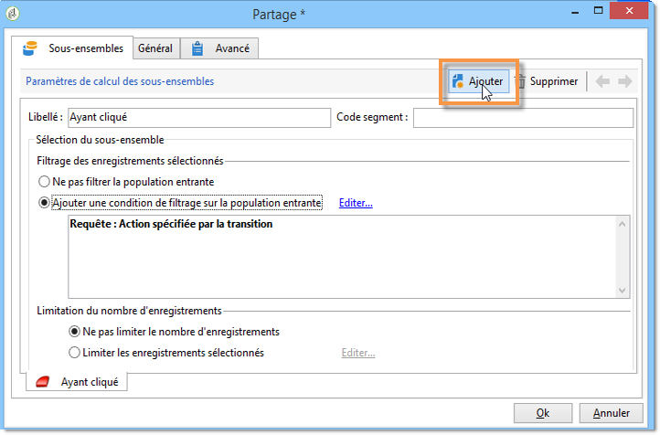 Dans l'onglet Sous-ensembles, définissez la première branche de partage. Par exemple, donnez le libellé "Ayant cliqué" pour cette branche.