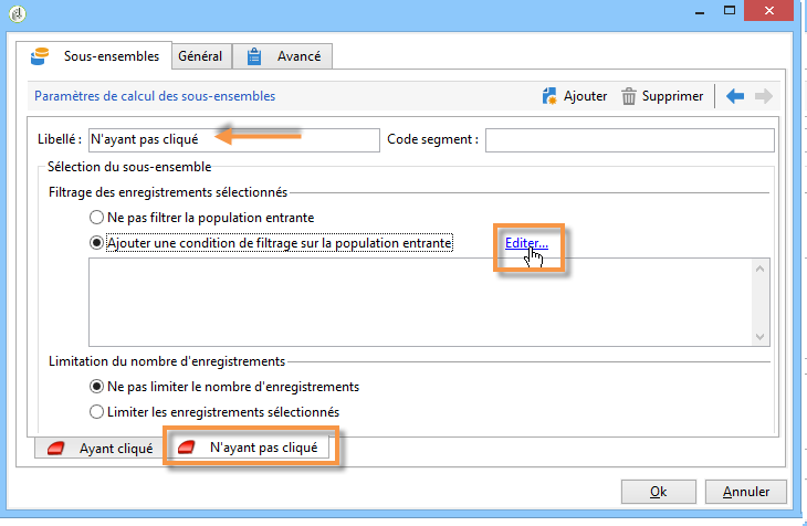 Cliquez sur Ajouter une condition de filtrage sur la population entrante. Cliquez ensuite sur Editer…