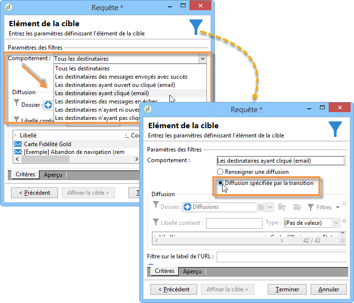 Dans la fenêtre Elément de la cible, sélectionnez le comportement Les destinataires n'ayant pas cliqué (email). Sélectionnez l'option Diffusion spécifiée par la transition comme pour la première branche.