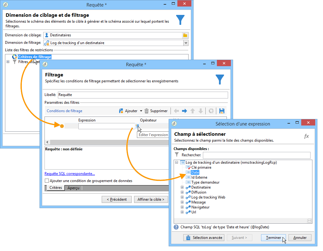 Au niveau des conditions de filtrage, cliquez sur l'icône Editer l'expression de la condition affichée en sous-arborescence des logs de tracking. Choisissez le champ Date.