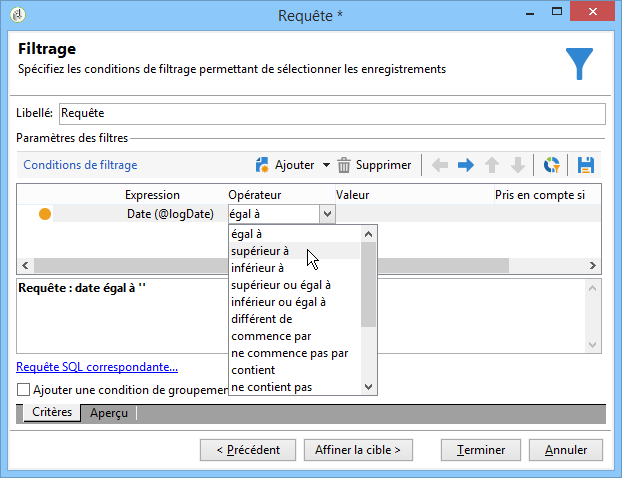 Afin de ne récupérer que les logs de tracking postérieurs aux 15 derniers jours, vous devez sélectionner l'opérateur Supérieur à.