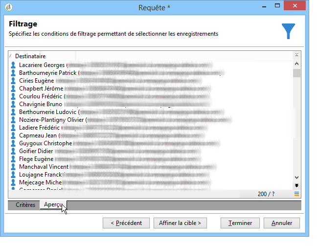 Cliquez sur le bouton Terminer de la fenêtre de formule. Dans la fenêtre de filtrage, cliquez sur l'onglet Aperçu pour vérifier les conditions de ciblage.