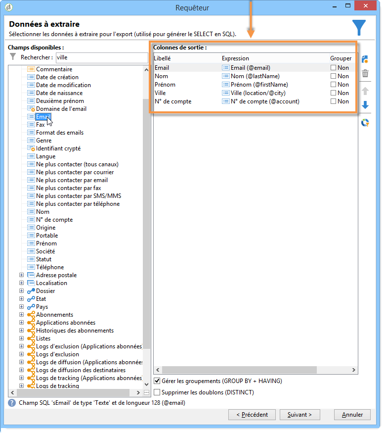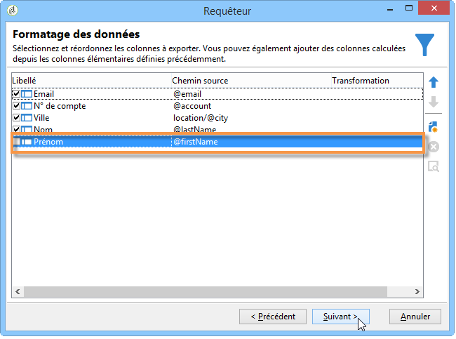 Sélectionnez : Nom, Prénom, Email, Ville et N° de compte. Ces champs sont alors intégrés à la section Colonnes de sortie. Cliquez sur Suivant.