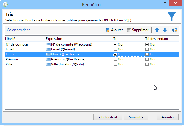Le résultat ne comporte que les destinataires dont le domaine d'email est "free.fr" et ne vivant pas à Paris. La colonne "Prénom" n'est pas affichée car elle a été décochée à l'étape précédente. Les numéros de compte sont triés de manière descendante.