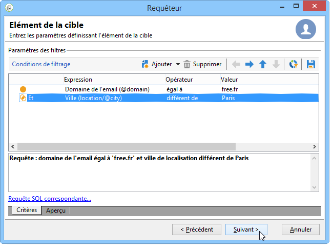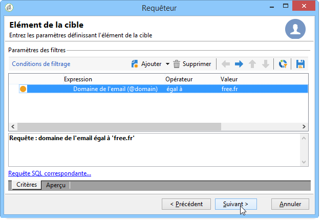 Le résumé de la requête s'affiche au bas de la fenêtre, soit : Domaine de l'email égal à 'free.fr'.