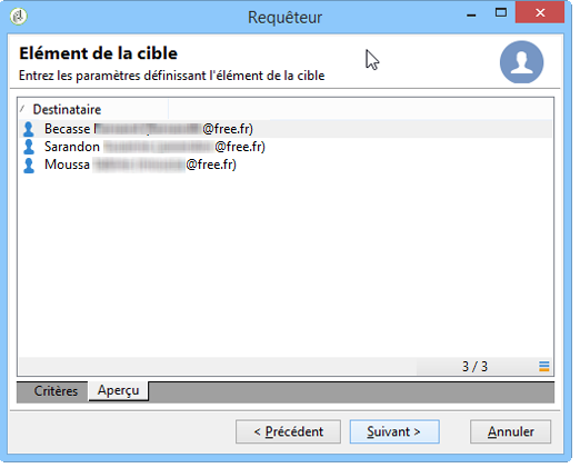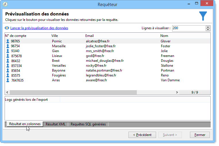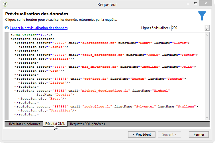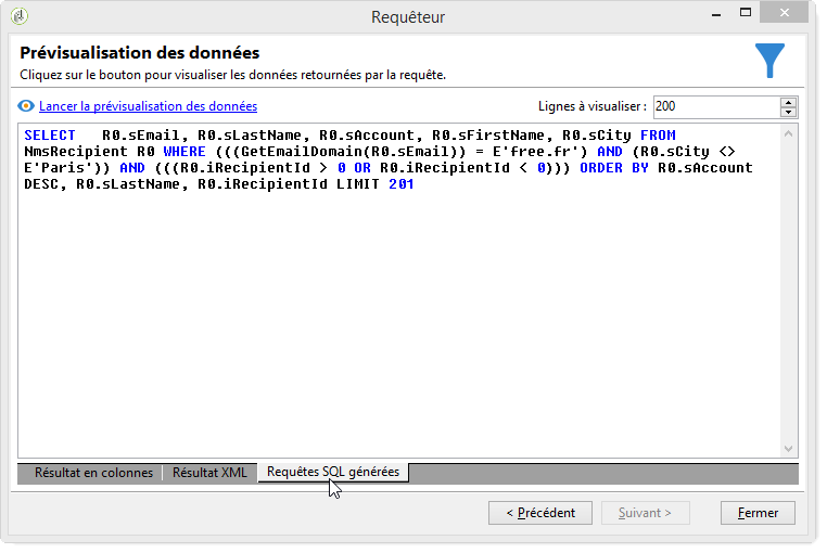 Cliquez sur l'onglet Aperçu pour avoir une première idée du résultat de la requête. Seuls les destinataires avec des domaines d'email "free.fr" sont affichés.