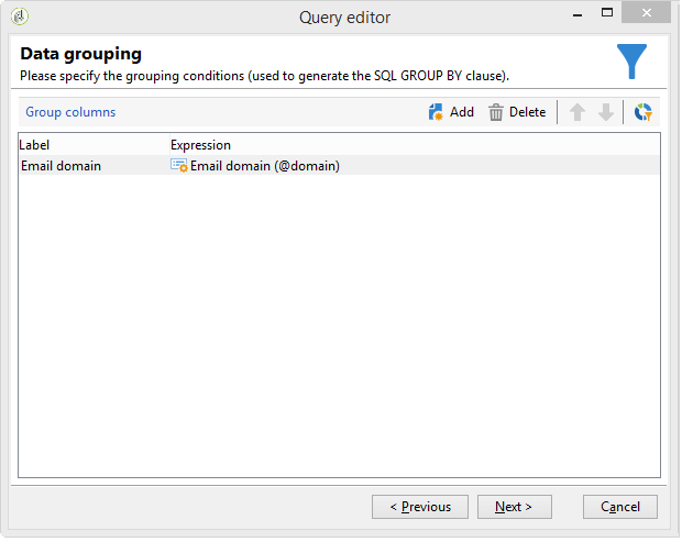 Dans la fenêtre Groupement des données, sélectionnez le Domaine de l'email en cliquant sur Ajouter.