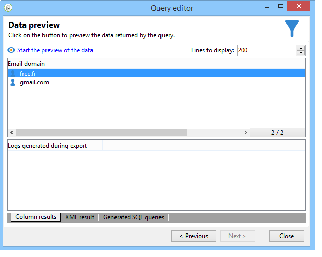 Dans la fenêtre de prévisualisation des données, cliquez sur Lancer la prévisualisation des données : ici, neuf domaines d'emails différents ciblés plus de 30 fois sont retournés en résultat.