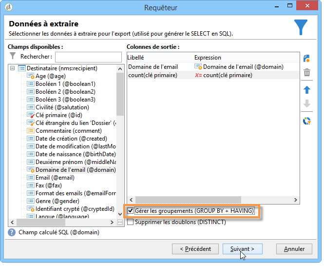 Dans la fenêtre Données à extraire, sélectionnez les champs Domaine de l'email et Clé primaire. Faites un comptage du champ Clé primaire.