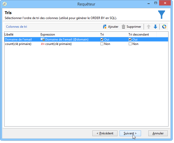 Dans la fenêtre Tris, ordonnez les domaines d'email en tri descendant. Pour cela, cochez Oui dans la colonne Tri descendant. Cliquez sur Suivant.