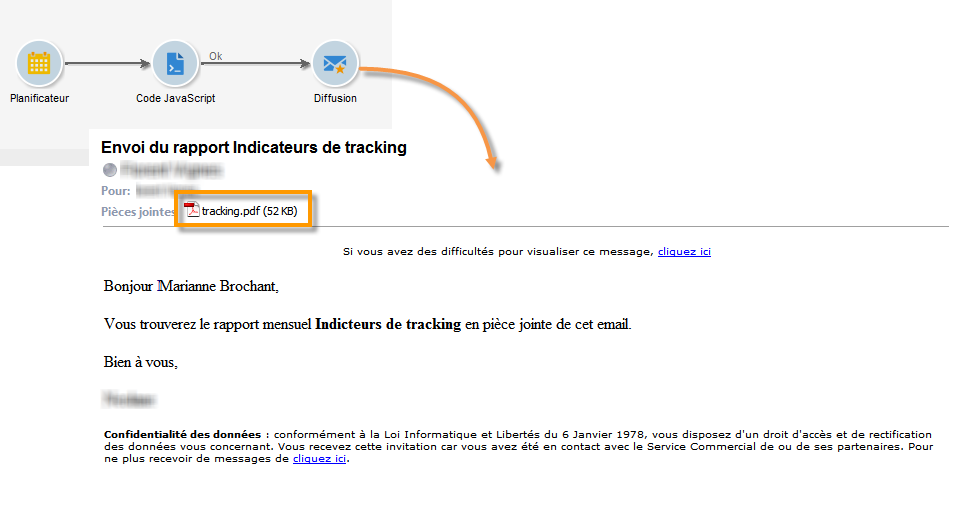 Ce cas pratique présente comment générer, chaque mois, le rapport d'usine Indicateurs de tracking au format PDF et l'envoyer à une liste de destinataires.