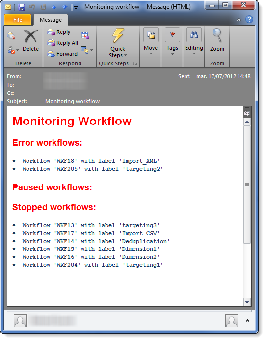 이 모니터링 워크플로우가 실행되면 수신자에게 다음 요약을 전송합니다.