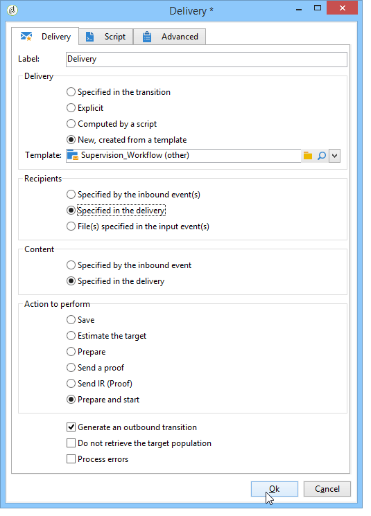 를 두 번 클릭합니다. 배달 활동을 수행하고 다음 옵션을 선택합니다.