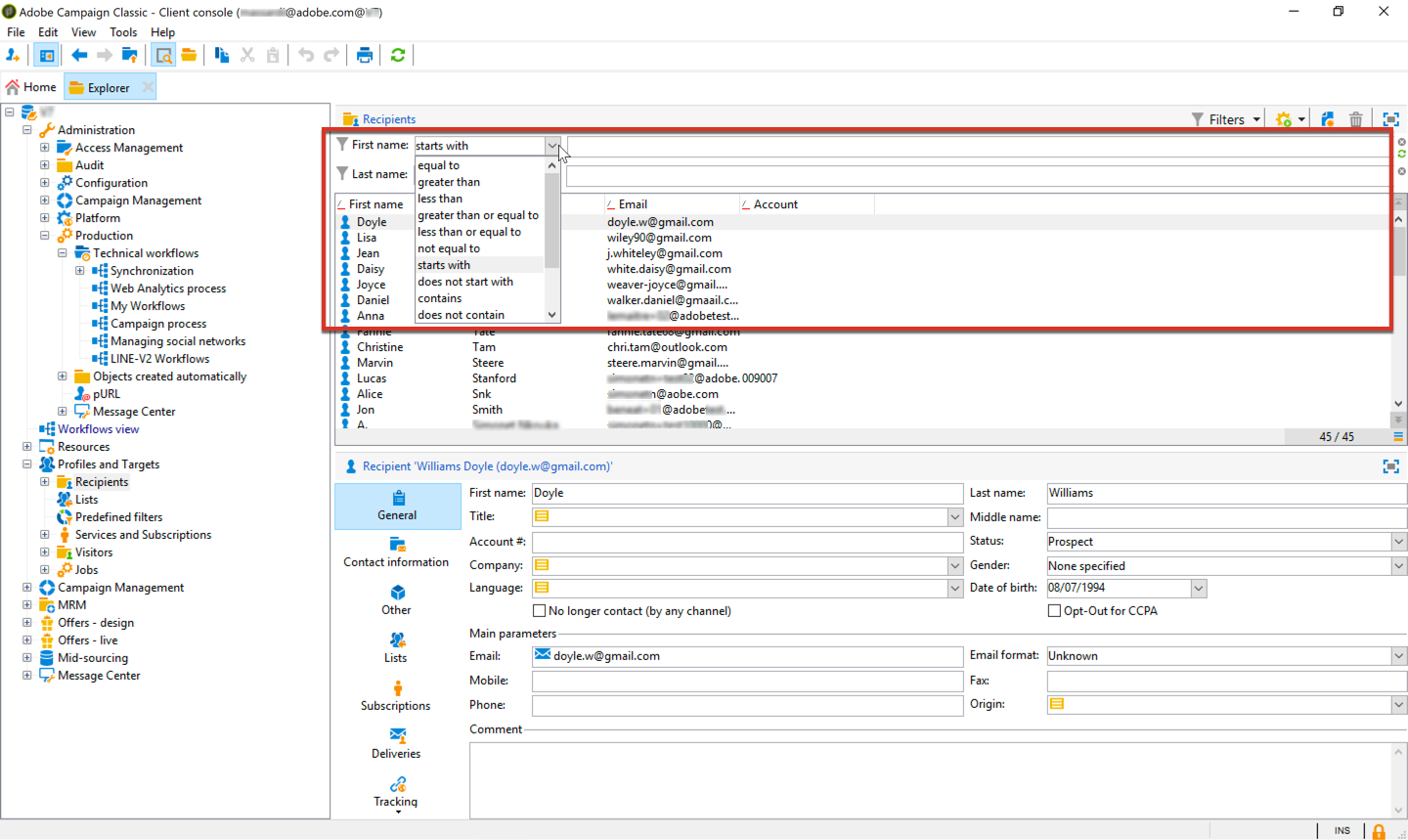 이제 검색 필터링을 수행할 수 있습니다 First name 및 Last name 다양한 필터 조건에 따른 필드입니다.