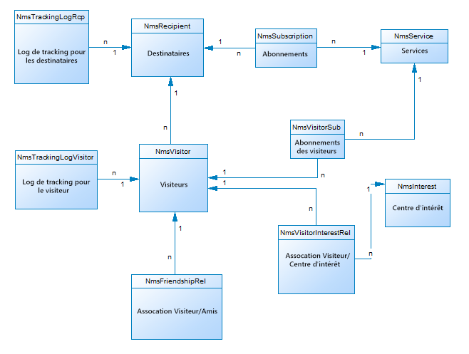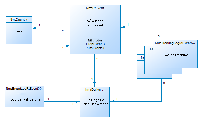Chaque enregistrement de cette table représente une action de diffusion ou un modèle de diffusion. Elle contient tous les paramètres nécessaires pour effectuer des diffusions (cible, contenu, etc.). Les logs de diffusion (NmsBroadLog) et leurs URL de tracking associées (NmsTrackingUrl) sont créés au cours de la phase d’analyse (voir ci-dessous pour plus de détails sur ces deux tables).